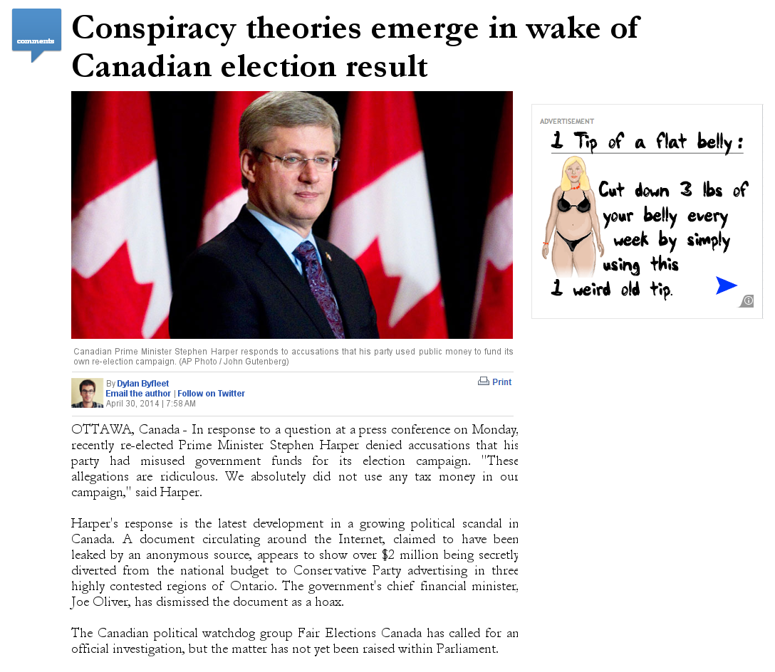 So, fine. Null result. Well, it was only 150 people. I decided to run down the effect by running a second study. This time I used a statistical power analysis to figure out that I should run 802 people to have a high chance of detecting a relatively small difference between groups. I also wanted to move away from conspiracies that people might have heard of and invent something entirely new. Instead of historical conspiracies or general thoughts about conspiracies, I showed my participants a fake news article about a fake political scandal in Canada (something about tax dollars being illegally funnelled into a re-election campaign). Half of the participants saw the headline “Corruption allegations emerge in wake of Canadian election,” while the other half saw “Conspiracy theories emerge in wake of Canadian election.” They then rated their thoughts on the allegations. The result? Same as before: no difference. The “conspiracy theories” people didn’t take the allegations any less seriously than the “corruption allegations” people did.